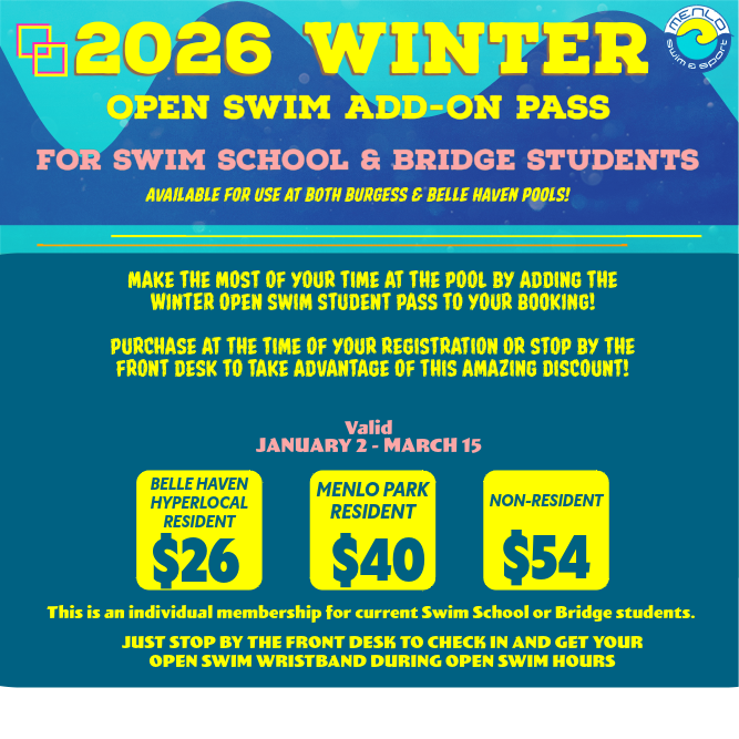 Whether you’re just starting your swim journey or looking to take your skills to the next level, Menlo Swim School is here to support and encourage you. We can’t wait to see you make a splash and help you become a safe, confident swimmer! Want to know more about our Swim School schedule and lessons? Sign up for our Swim School Mailing list!