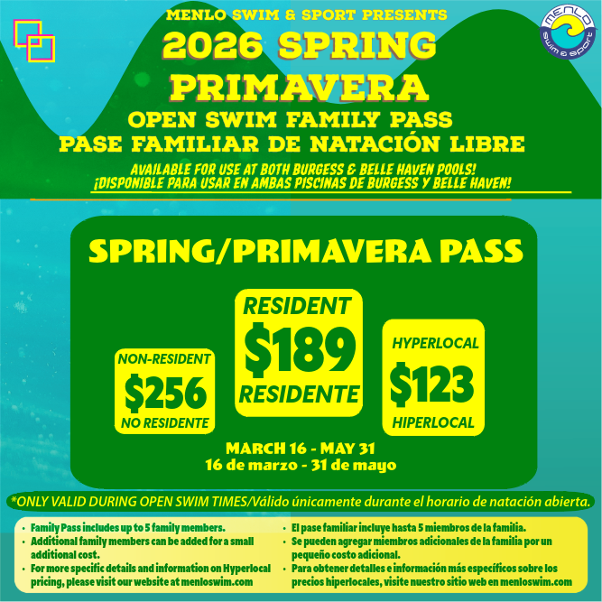 - Spring/Summer open swim family pass does not guarantee access if pool is at capacity